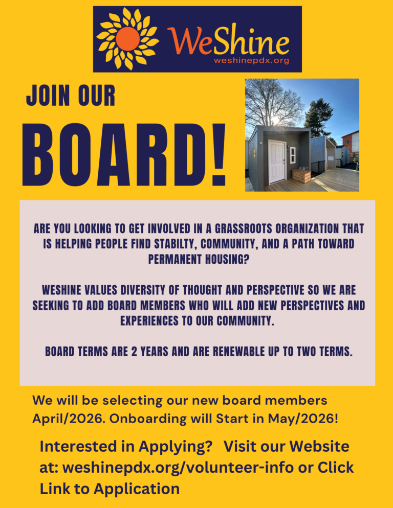 At the moment, we don’t have any active village site or villager-facing volunteer roles open, but we’re continuing to grow and evolve as an organization, and that can change. If you’re someone who’s in it for the long haul and shares our values, we’d love to stay connected. Reach out to volunteers@weshinepdx.org and we’ll be in touch as things develop.
